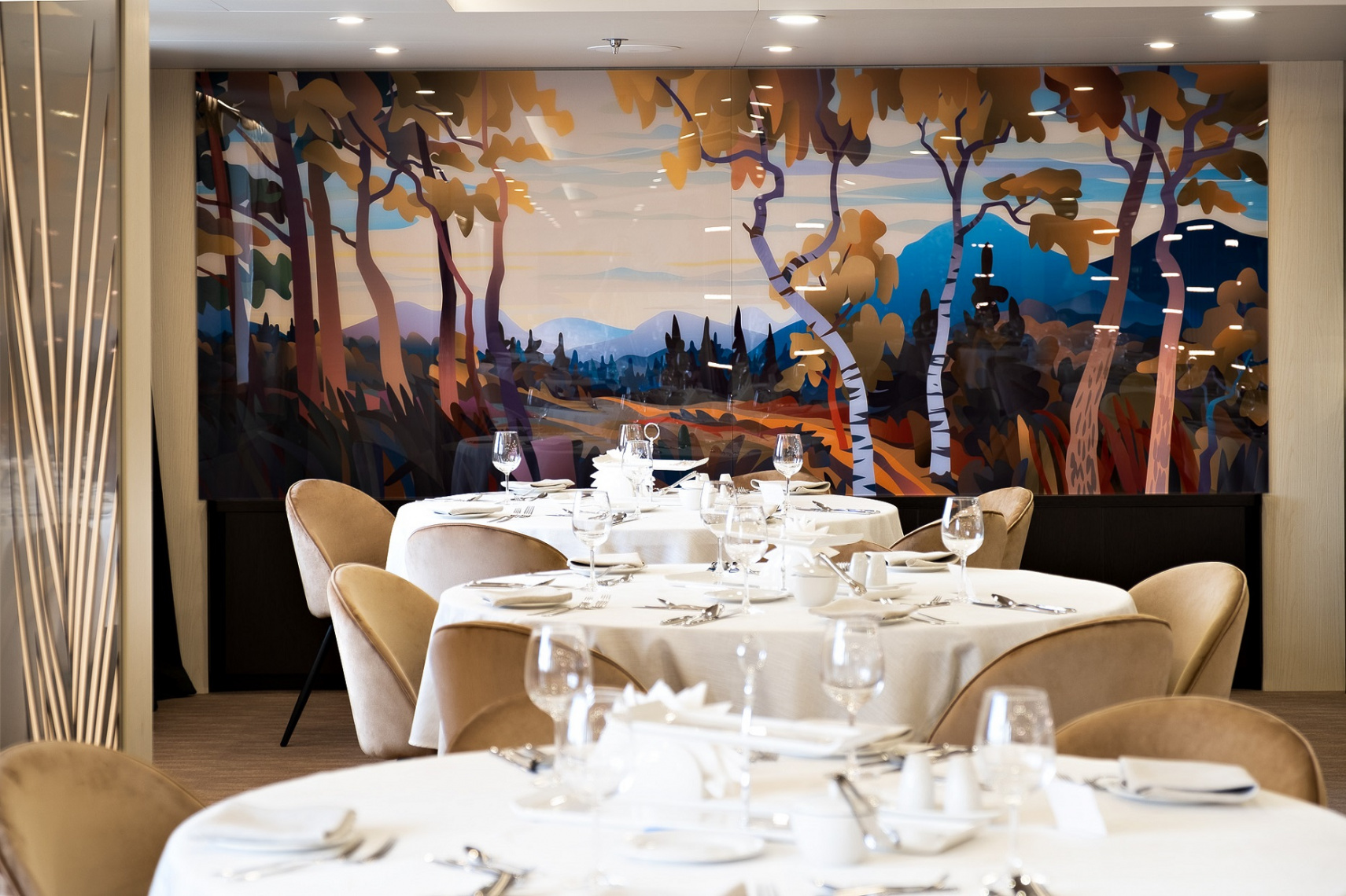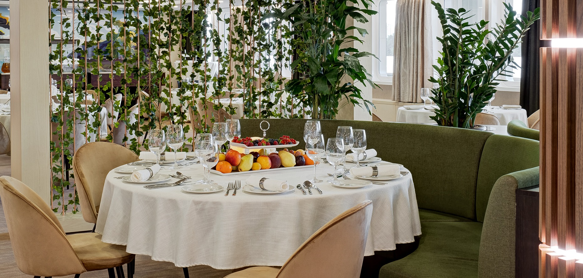 В роскошных интерьерах ресторанов «Агидель» и «Иремель» будет сервирован ужин с изысканными блюдами от бренд-шефов и команды поваров теплохода «Мустай Карим». Несколько видов салатов, теплые и холодные закуски, основная подача горячего на выбор, фирменный торт «Волжская галька» и другие сладости на десерт. Чтобы отметить праздник, вы можете выбрать бранч с приветственным бокалом игристого или пакет напитков, включающий игристое, белое и красное вина без ограничений.