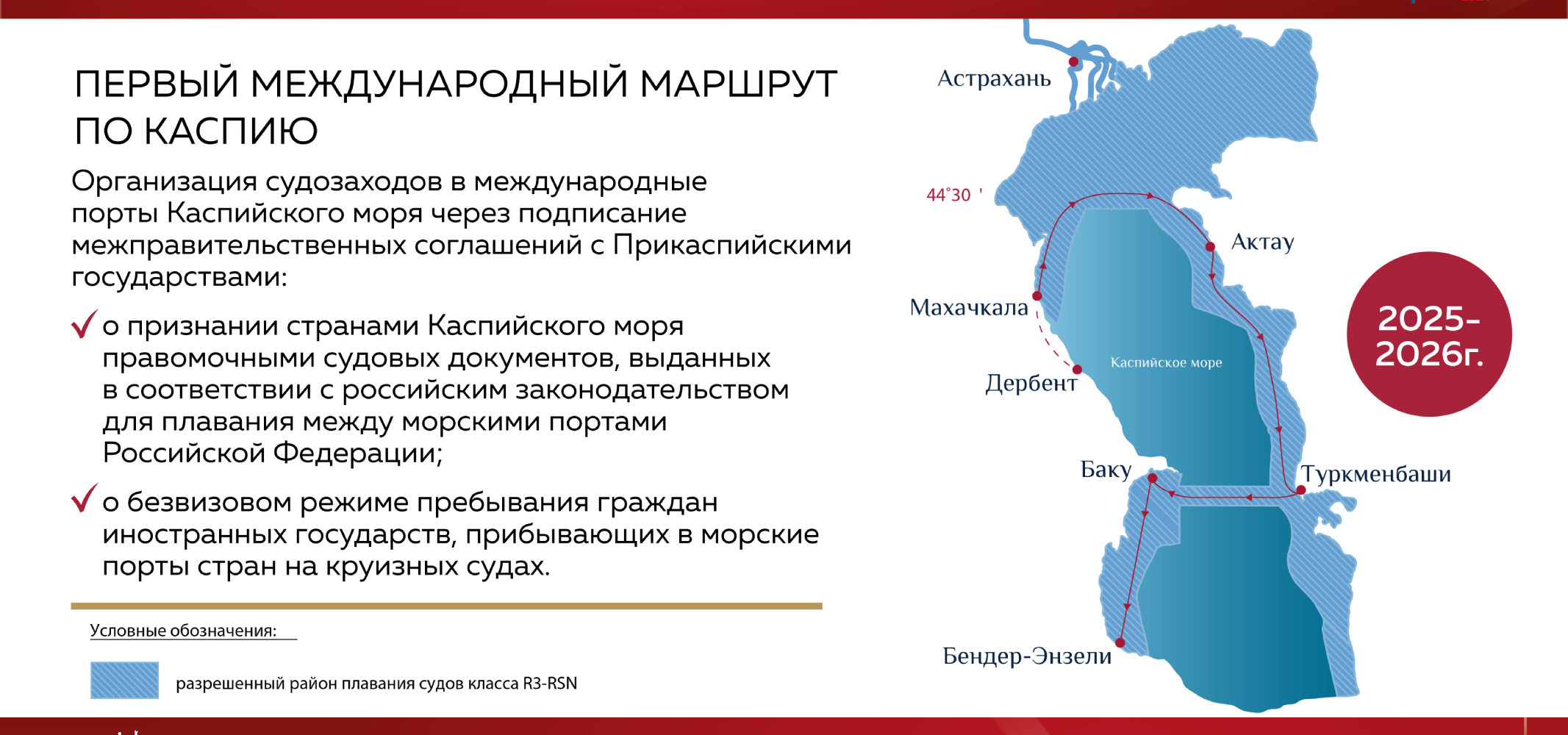 «Мы прорабатываем возможность судозаходов совместно с Минтрансом России. Для этого нам всем придется поработать, заключение соглашений — процесс небыстрый. Плюс в двух странах — Иране и Туркмении нужны визы. Необходимо на законодательном уровне данных стран обеспечить возможность безвизового захода круизных туристов, подобно тому, как это было сделано в Санкт-Петербурге», — рассказал Ришат Багаутдинов.