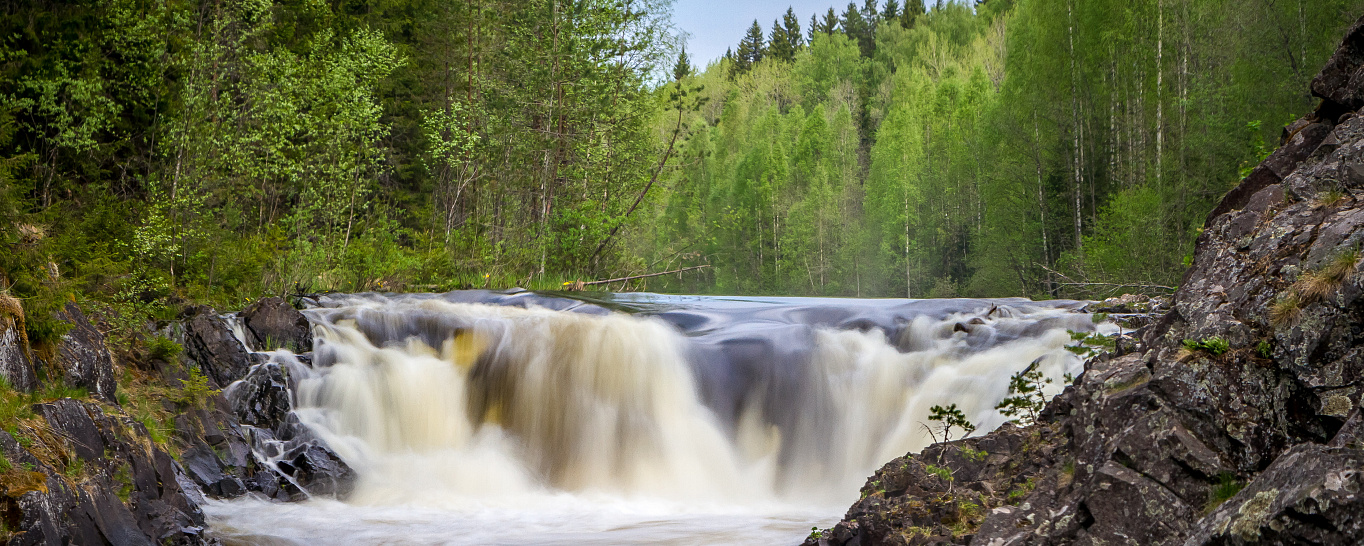 Выглядит водопад на удивление по-тропически и имеет несвойственный для Карелии экзотический вид. Белопенные чистые струи красиво обрамляет свежая зелень деревьев.