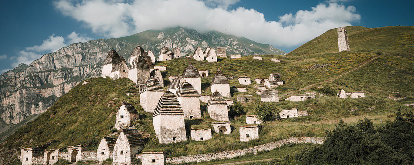 Даргавс – небольшое село в горах Северной Осетии. Сейчас там практически никто не живет, но ежегодно сюда приезжает множество туристов посмотреть на знаменитый «Город мертвых», расположенный неподалеку. Хотя издали белые дома с черными крышами напоминают настоящий аул, свое трагичное название это место получило не случайно – здесь находится самый большой могильник во всем регионе. Даргавский некрополь состоит из 90 хорошо сохранившихся двух- и четырёхэтажных каменных склепов, изучение которых ведётся со второй половины 20 века. Здесь было найдено множество предметов быта, украшений и оружия, которые сейчас хранятся в Национальном музее Республики Северная Осетия – Алания. Сейчас захоронения составляют единый архитектурно-этнографический комплекс, который позволяет погрузиться в уникальную историю этого места.