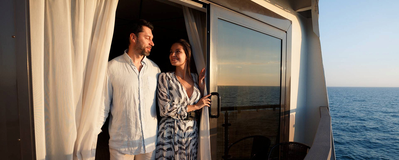 Если вы выбрали каюту с балконом, тогда персональная круглосуточная фотостудия в речном стиле вам обеспечена на все время круиза. Меняйте образы от экстравагантного вечернего платья до уютного халата, с бокалом вина на закате или с чашкой кофе на рассвете — на собственной панорамной веранде возможен любой креатив и эксперименты. Каюты с балконами есть на теплоходах «Мустай Карим» и «Мстислав Ростропович».