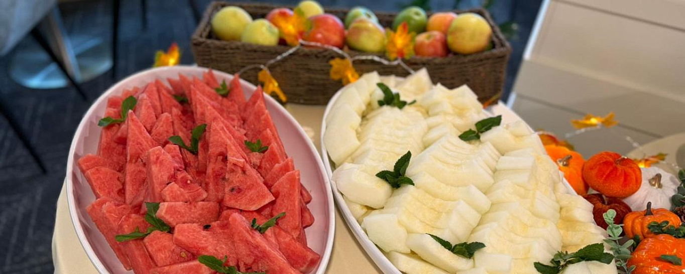 Щедрый осенний буфет с сезонными фруктами впечатлил туристов на теплоходе «Нижний Новгород». Сочные арбузы, спелые дыни, золотистые нектарины и не только предлагают гостям на завтраках по системе «шведский стол».