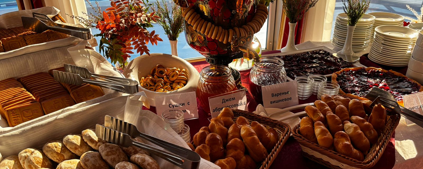 Участники круиза на теплоходе «Ленин» с удовольствием посещали уютные осенние чаепития — за время речного путешествия они успели стать доброй традицией. К ароматному чаю из самовара на стол подавали абрикосовый джем с яблоками, ягодный пирог и фирменные круассаны с различными начинками, которые выпекаются прямо на борту. В такой атмосфере сами собой возникают задушевные разговоры.
