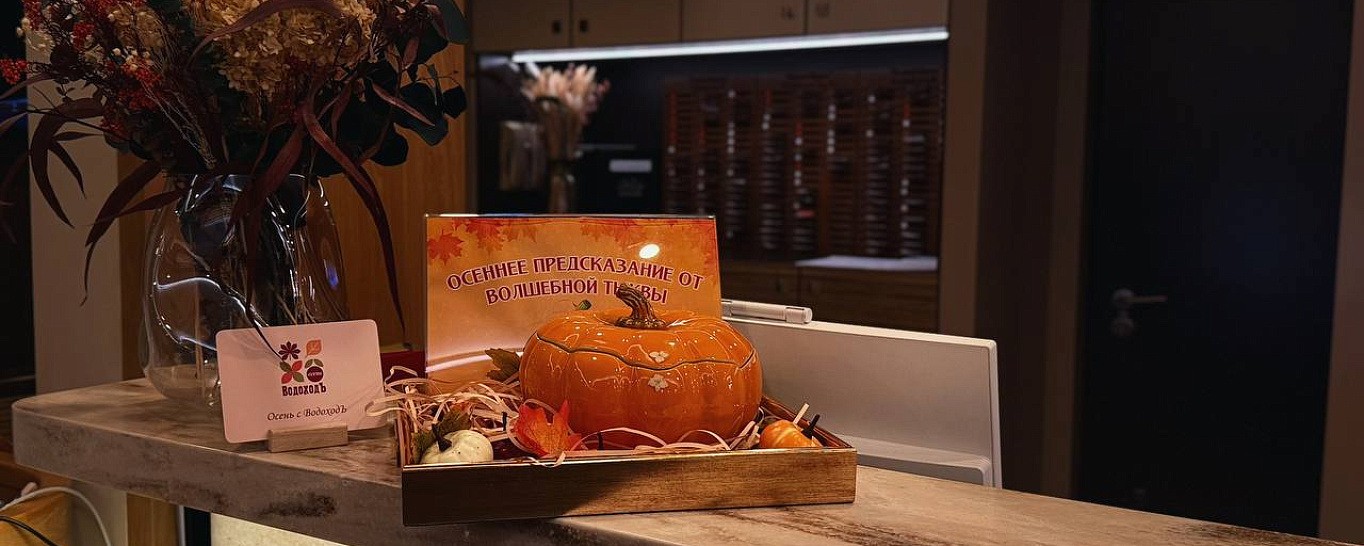 Осеннее предсказание от «волшебной тыквы» в зоне ресепшен может взять любой желающий участник круиза на теплоходе «Мустай Карим».