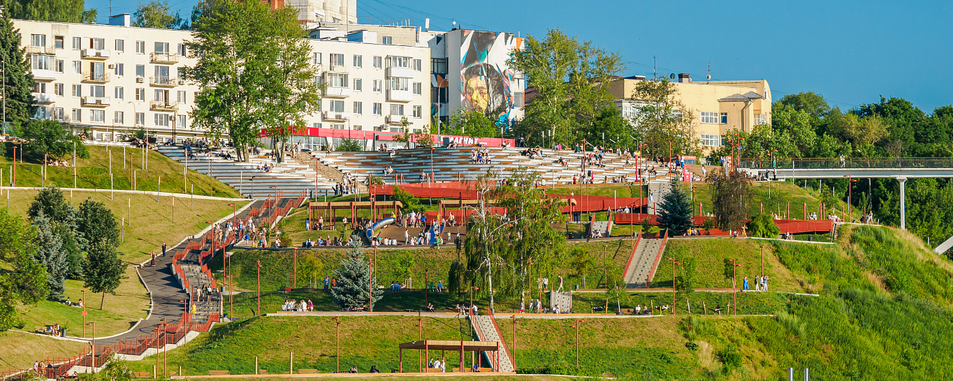 Набережную обновили и сделали здесь «театр природных действий» — большой амфитеатр с террасами, дорожками и зонами для различных активностей. В итоге на набережной вырос современный, большой и красивый парк — Парк 800-летия Нижнего Новгорода.