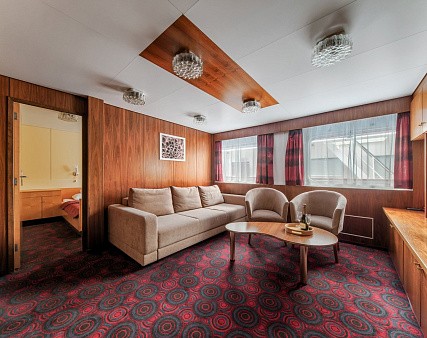 Площадь каюты 26,9 м2 (спальная комната - 9,7 м2, гостиная - 17,2 м2)