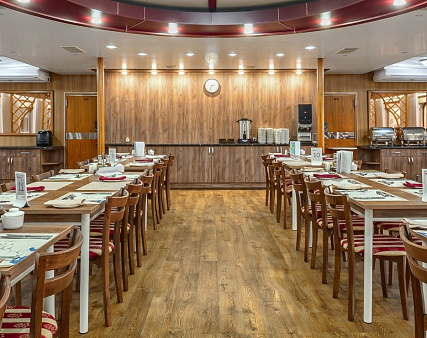 - Завтрак — шведский стол или заказная система с элементами шведского стола, фиксированная рассадка. Включённые напитки (без ограничения): вода, сок, чай, кофе. В рейсах до 4-х дней при ранней высадке в день прибытия завтрак континентальный;