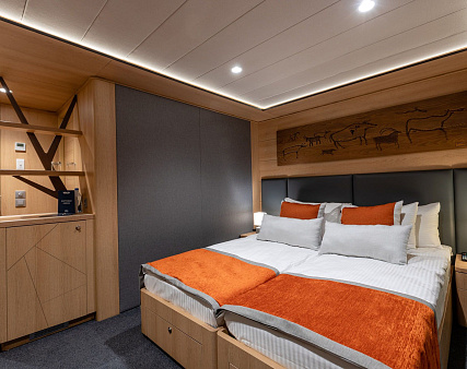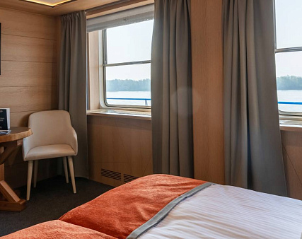 Площадь до 18,9 м2. Однокомнатная каюта с удобствами (душ, санузел, кондиционер) рассчитана на размещение до двух человек.