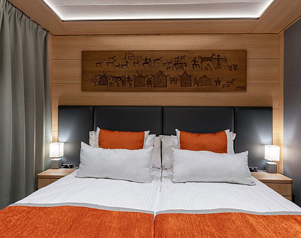 В каюте: две односпальные кровати или двуспальная кровать, шкаф для одежды, холодильник, телевизор, фен, сейф, радио, два окна, электророзетка на 220V: