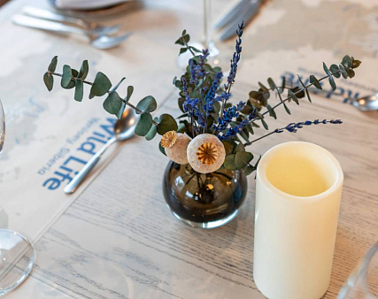 - Ужин – заказная система с включенными напитками (вода, чай, кофе, домашний морс, пиво) без ограничения и сибирскими настойками на аперитив (2 шота), фиксированная рассадка;