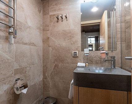 Площадь 12,5 м2. Однокомнатная каюта с удобствами (душ, санузел, кондиционер) рассчитана на размещение до двух человек.