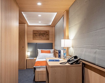 Площадь 12,5 м2. Однокомнатная каюта с удобствами (душ, санузел, кондиционер) рассчитана на размещение до двух человек.