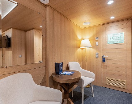 В каюте: односпальная кровать, шкаф для одежды, радио, кондиционер, телевизор, холодильник, фен, сейф, душ, санузел, обзорное окно, электророзетка на 220V.