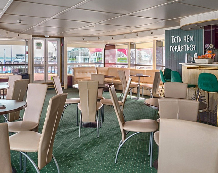 - Ужин — заказная система питания (выбор блюд со 2-го дня круиза). Включённые напитки (без ограничения): вода, чай, кофе, кисломолочный напиток (1 стакан 200 мл на ужин по запросу гостя). На выбор: вино красное / белое / игристое (1 бокал, 125 мл) / водка (1 рюмка, 50 мл) / пиво (1 бокал, 300 мл), домашний морс (1 бокал, 200 мл);