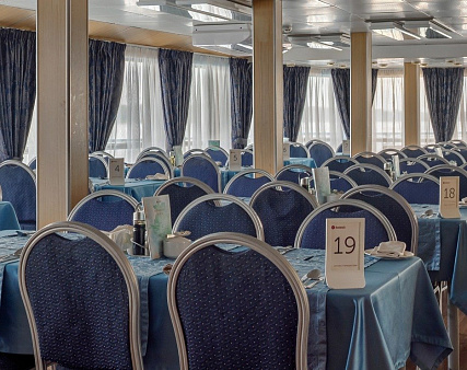 - Ужин — заказная система питания (выбор блюд со 2-го дня круиза). Включённые напитки (без ограничения): вода, чай, кофе, кисломолочный напиток (1 стакан 200 мл на ужин по запросу гостя). На выбор: вино красное / белое / игристое (1 бокал, 125 мл) / водка (1 рюмка, 50 мл) / пиво (1 бокал, 300 мл), домашний морс (1 бокал, 200 мл);