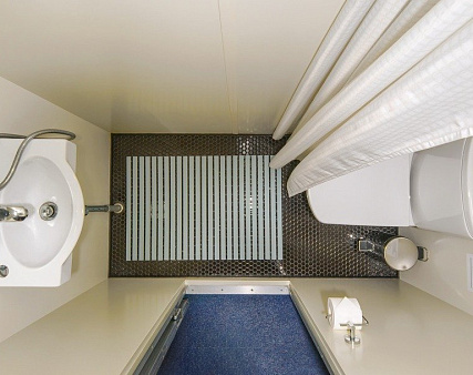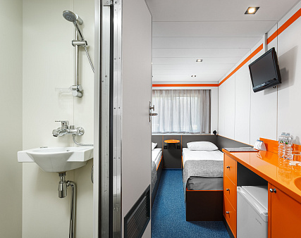 В каюте: две односпальные кровати (не сдвигаются), кресло, шкаф для одежды, пуфик, сейф, телевизор, холодильник, радио, обзорное окно, душ (душевая штора из водоотталкивающего материала или душевая стеклянная ширма), санузел, кондиционер, фен, электророзетка на 220V.