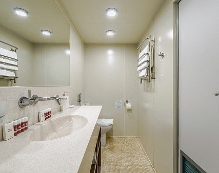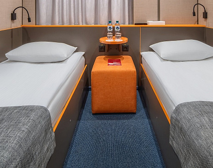 В каюте: две односпальные кровати (не сдвигаются), кресло, шкаф для одежды, пуфик, сейф, телевизор, холодильник, радио, обзорное окно, душ (душевая штора из водоотталкивающего материала или душевая стеклянная ширма), санузел, кондиционер, фен, электророзетка на 220V.