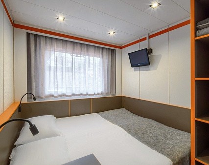 В каюте: одно спальное место, холодильник, минибар, сейф, телевизор, шкаф для одежды, радио, душ, санузел, кондиционер, обзорное окно, фен, электророзетка на 220V.