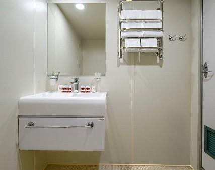 В каюте: две односпальные кровати, холодильник, минибар, сейф, телевизор, шкаф для одежды, радио, обзорное окно, душ, санузел, кондиционер, фен, сейф, электророзетка на 220V.