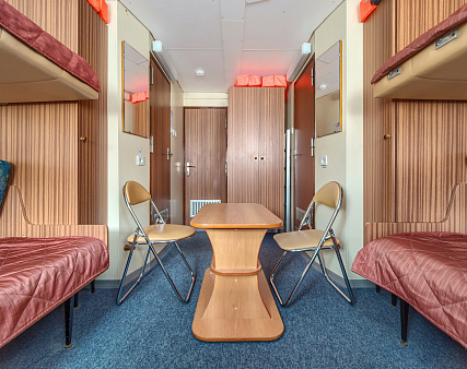 В каюте: четыре спальных места (два внизу, два вторым ярусом), шкаф для одежды, холодильник, кондиционер, радио, два обзорных окна, электророзетка на 220V.