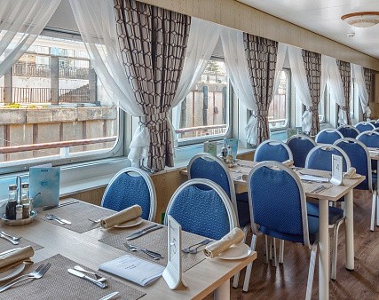 - Ужин — заказная система питания (выбор блюд со 2-го дня круиза). Включённые напитки (без ограничения): вода, чай, кофе, кисломолочный напиток (1 стакан 200 мл. на ужин по запросу гостя).