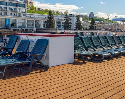 Просторная каюта с современным интерьером, четыре отдельных спальных места, шкаф для одежды, журнальный столик, телевизор c DVD, душ, санузел, холодильник, радио, два обзорных окна, электророзетка на 220V, фен.
