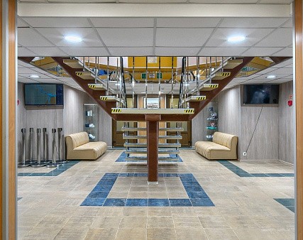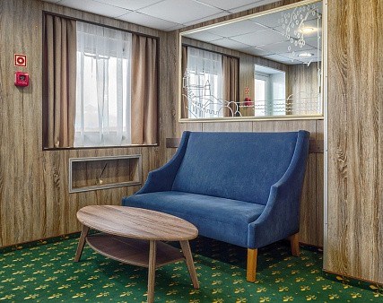 Просторная каюта с современным интерьером, мягкая мебель — диван, два кресла, двуспальная кровать, шкаф для одежды, телевизор c DVD, холодильник, радио, три обзорных окна, электророзетка на 220V, фен, кондиционер.