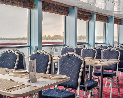 - Ужин — заказная система питания (выбор блюд со 2-го дня круиза). Включённые напитки (без ограничения): вода, чай, кофе, кисломолочный напиток (1 стакан 200 мл на ужин по запросу гостя). На выбор: вино красное / белое / игристое (1 бокал, 125 мл) / водка (1 рюмка, 50 мл) / пиво (1 бокал, 300 мл), домашний морс (1 бокал, 200 мл);