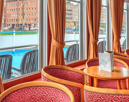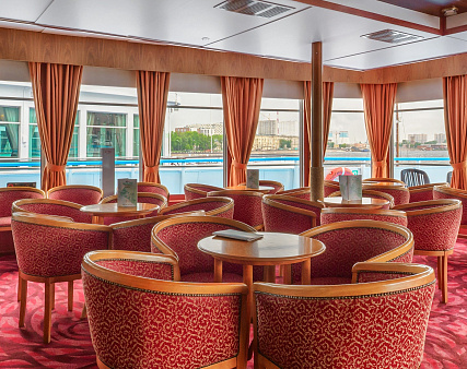 - Ужин — заказная система питания (выбор блюд со 2-го дня круиза). Включённые напитки (без ограничения): вода, чай, кофе, кисломолочный напиток (1 стакан 200 мл на ужин по запросу гостя). На выбор: вино красное / белое / игристое (1 бокал, 125 мл) / водка (1 рюмка, 50 мл) / пиво (1 бокал, 300 мл), домашний морс (1 бокал, 200 мл);