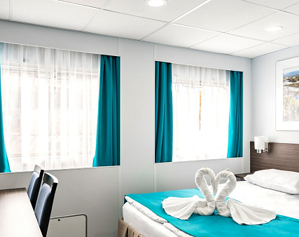 В каюте: две односпальные (сдвинуть нельзя) кровати, шкаф для одежды, трюмо, телевизор, холодильник, сейф, фен, радио, одно обзорное окно, электророзетка на 220V.