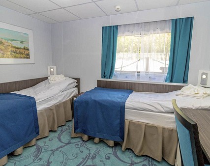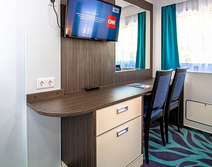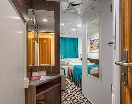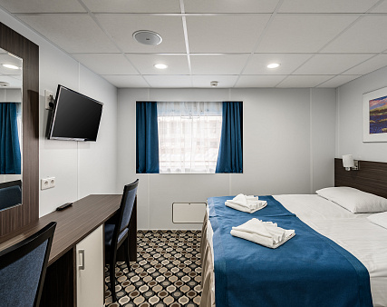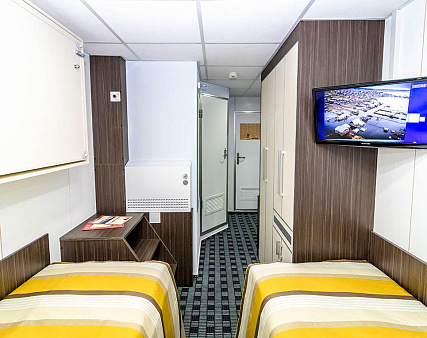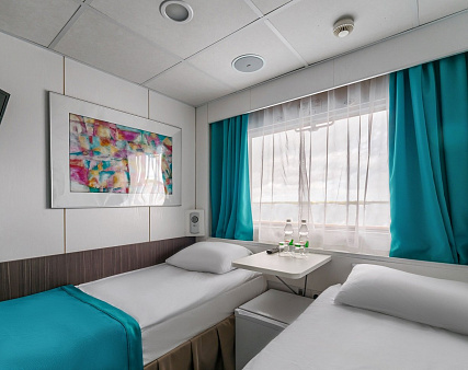В каюте: две односпальные (сдвинуть нельзя) кровати, шкаф для одежды, трюмо, телевизор, холодильник, сейф, фен, радио, одно обзорное окно, электророзетка на 220V.