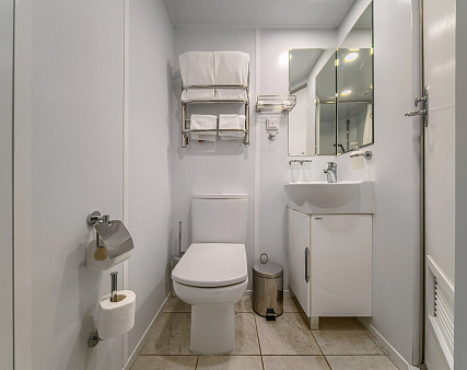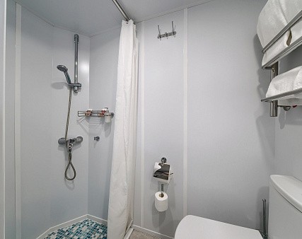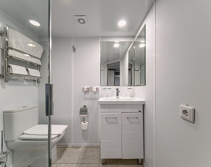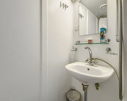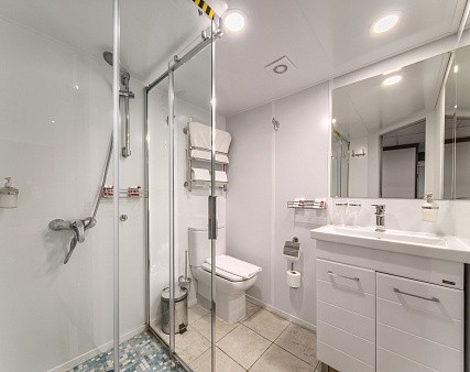 В каюте: одно спальное место, шкаф для одежды, радио, телевизор, холодильник, сейф, фен, душ, санузел, кондиционер, обзорное окно, электророзетка на 220V.