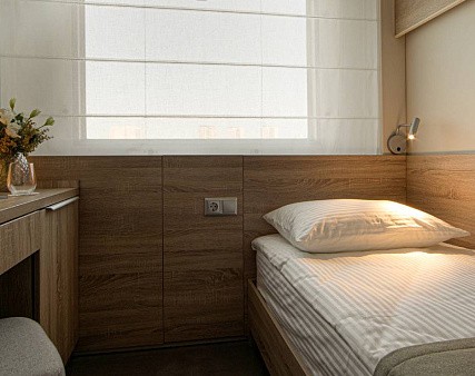 В каюте: одно спальное место, шкаф для одежды, радио, кондиционер, душ, санузел, холодильник, телевизор, фен, обзорное окно, электророзетка на 220V, площадь каюты до 7,7 м2.