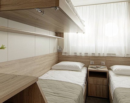 В каютах № 301, 302, 303, 304 — двуспальная кровать, диван (не раскладывается, можно разместить одного человека), площадь каюты 25,4 м2