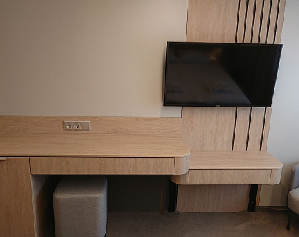 В каюте: двуспальная кровать, шкаф для одежды, сейф, телевизор, холодильник, радио, обзорное окно, душ, санузел, кондиционер, фен, электророзетка на 220V.