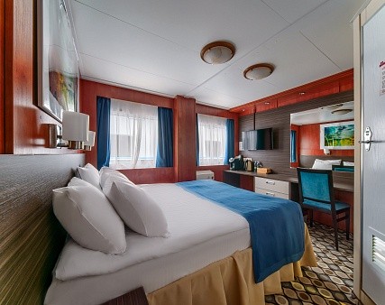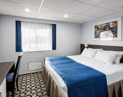 В каюте: три спальных места (два внизу, одно — вторым ярусом), шкаф для одежды, трюмо, кондиционер, радио, телевизор, холодильник, фен, сейф, обзорное окно, электророзетка на 220V.