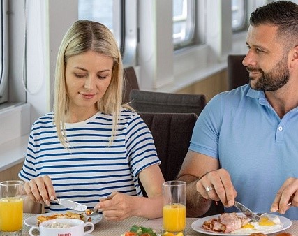 - Полупансион (завтрак + ужин): завтрак — шведский стол или заказная система с элементами шведского стола, фиксированная рассадка. Включённые напитки (без ограничения): вода*, сок, чай, кофе; ужин — заказная система питания (выбор блюд со 2-го дня круиза), фиксированная рассадка. Включённые напитки (без ограничения): вода*, чай, кофе, кисломолочный продукт (1 стакан, 200 мл); порционно на выбор - вино красное / белое / игристое (1 бокал, 125 мл) / водка (1 рюмка, 50 мл) / пиво (1 бокал, 300 мл) / домашний морс (1 бокал, 200 мл).