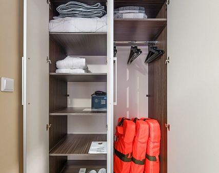 В каюте: два спальных места, шкаф для одежды, трюмо, кондиционер, радио, телевизор, холодильник, фен, сейф, обзорное окно, электророзетка на 220V.