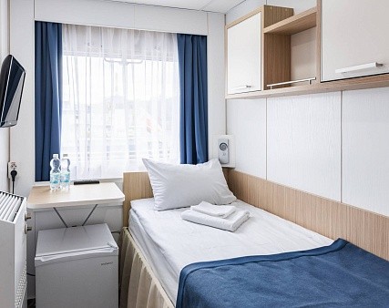 В каюте: одно спальное место, шкаф для одежды, кондиционер, радио, телевизор, холодильник, фен, сейф, обзорное окно, электророзетка на 220V, душ, санузел.