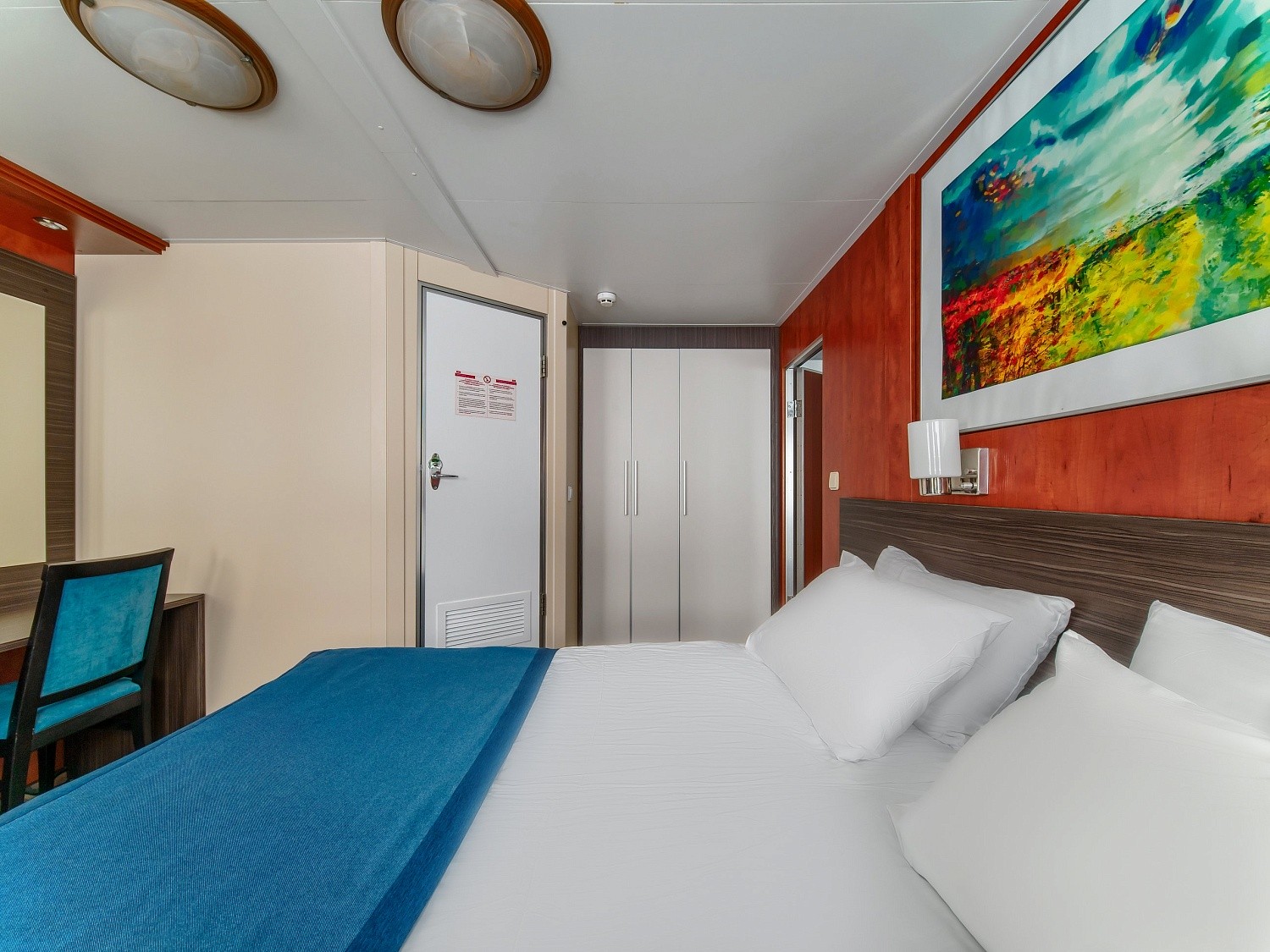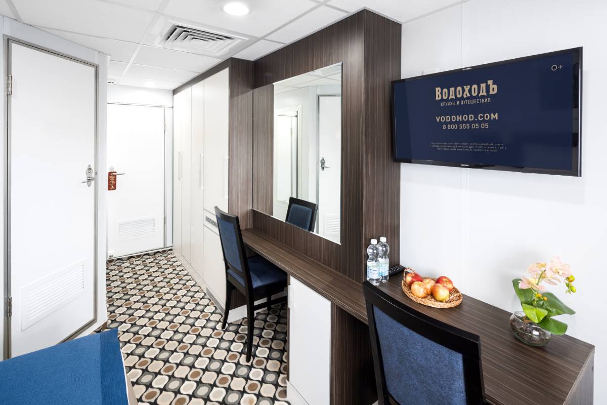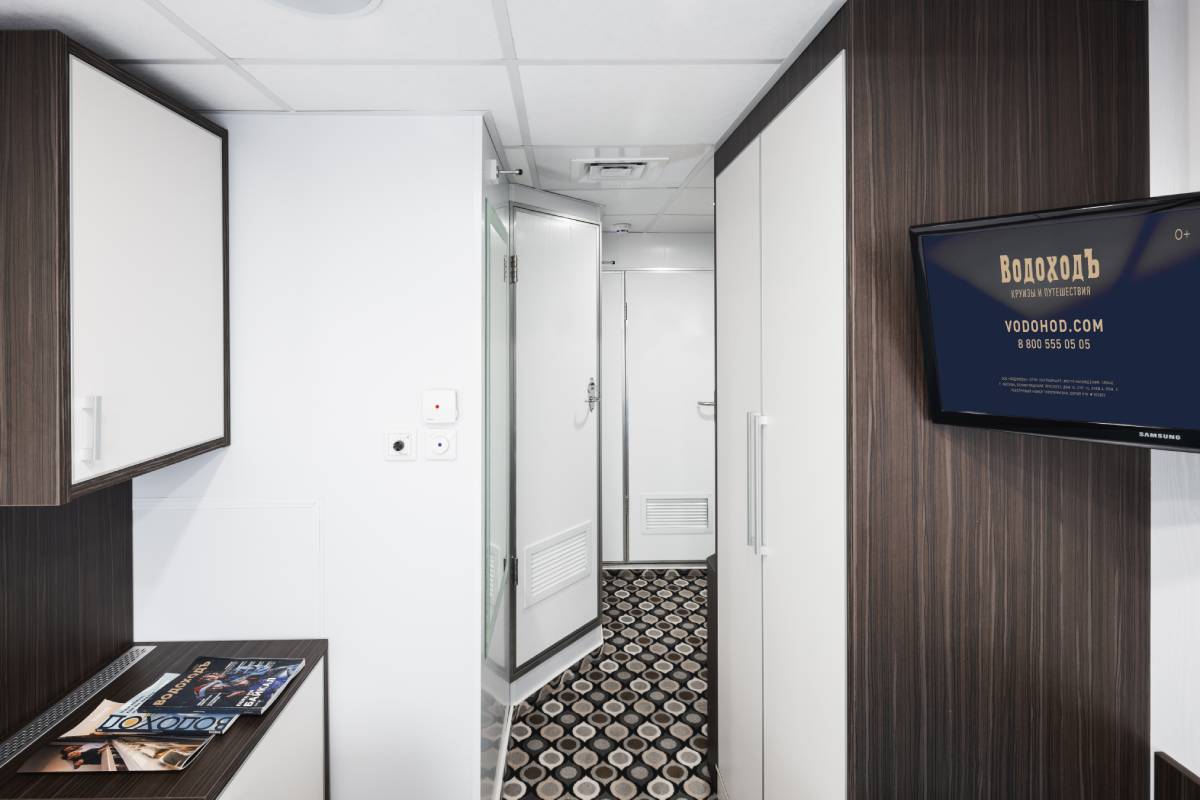 В каюте: три спальных места (два внизу, одно — вторым ярусом), шкаф для одежды, трюмо, кондиционер, радио, телевизор, холодильник, фен, сейф, обзорное окно, электророзетка на 220V.