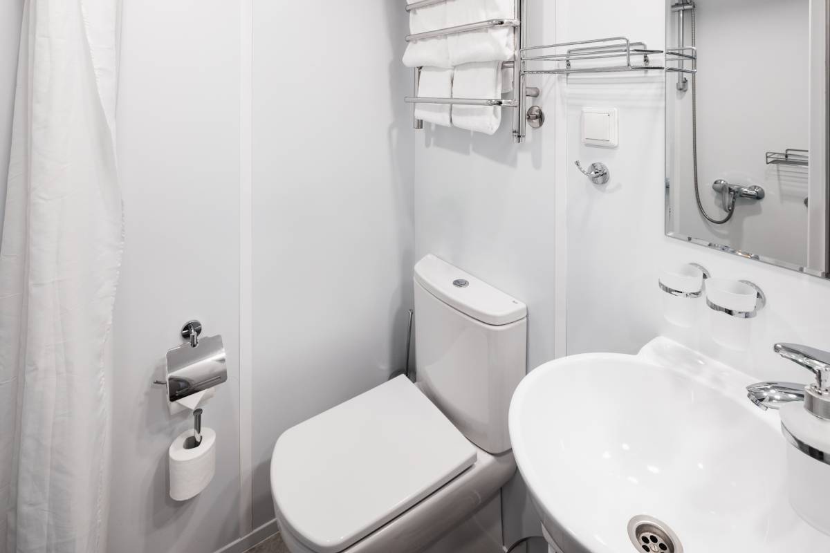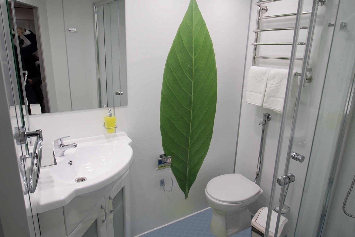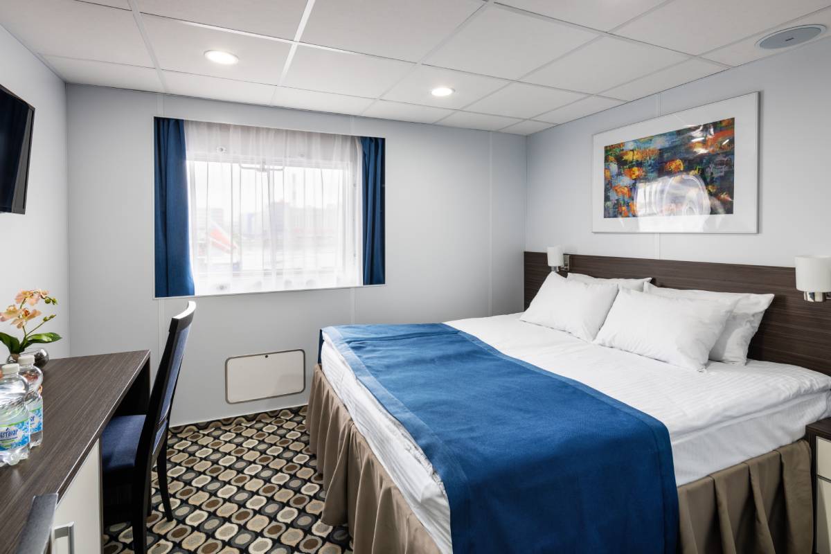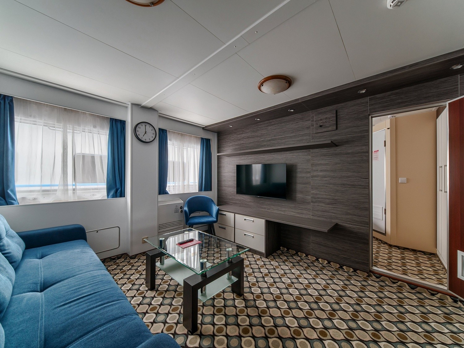 В каюте: три спальных места (два внизу, одно — вторым ярусом), шкаф для одежды, трюмо, кондиционер, радио, телевизор, холодильник, фен, сейф, обзорное окно, электророзетка на 220V.