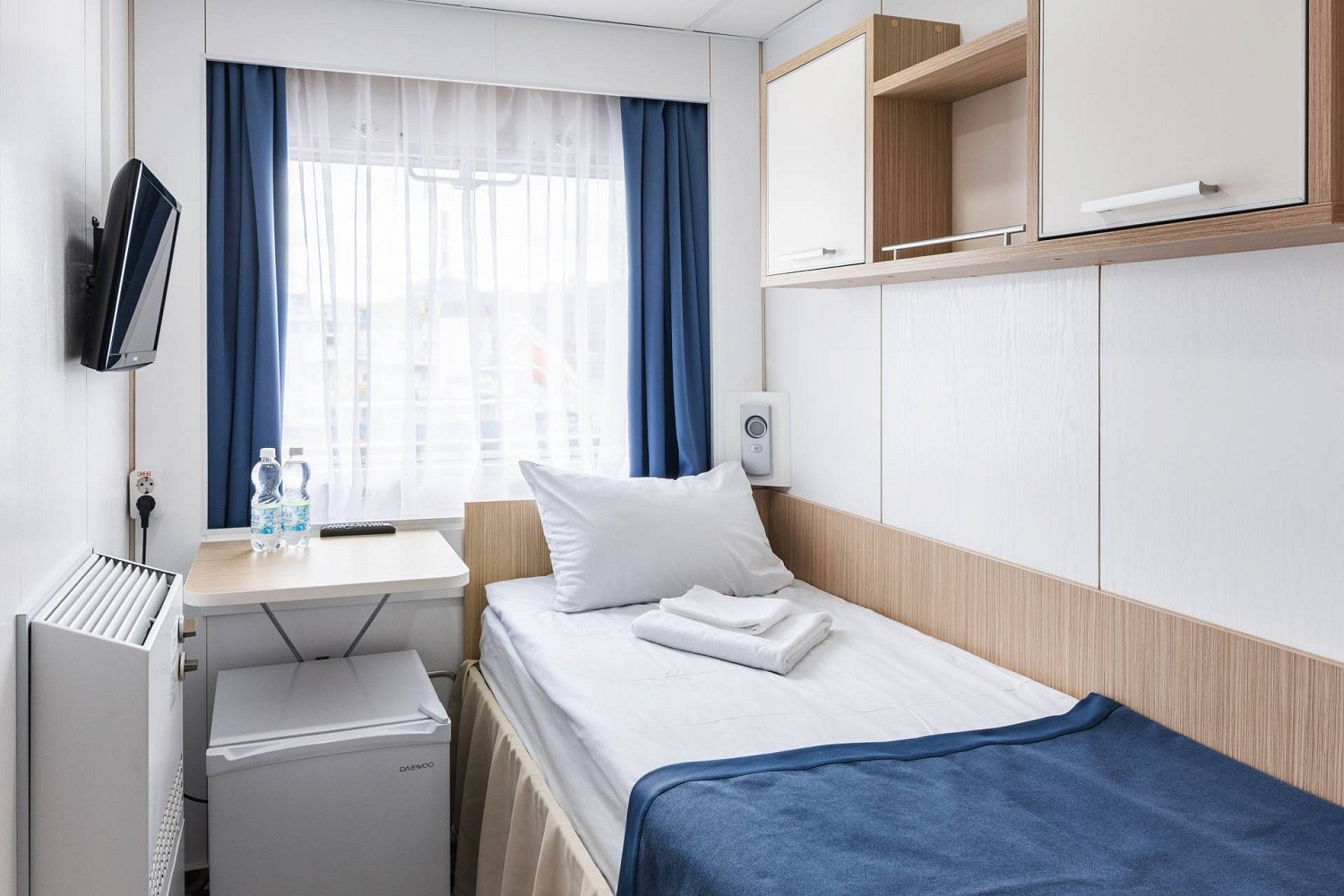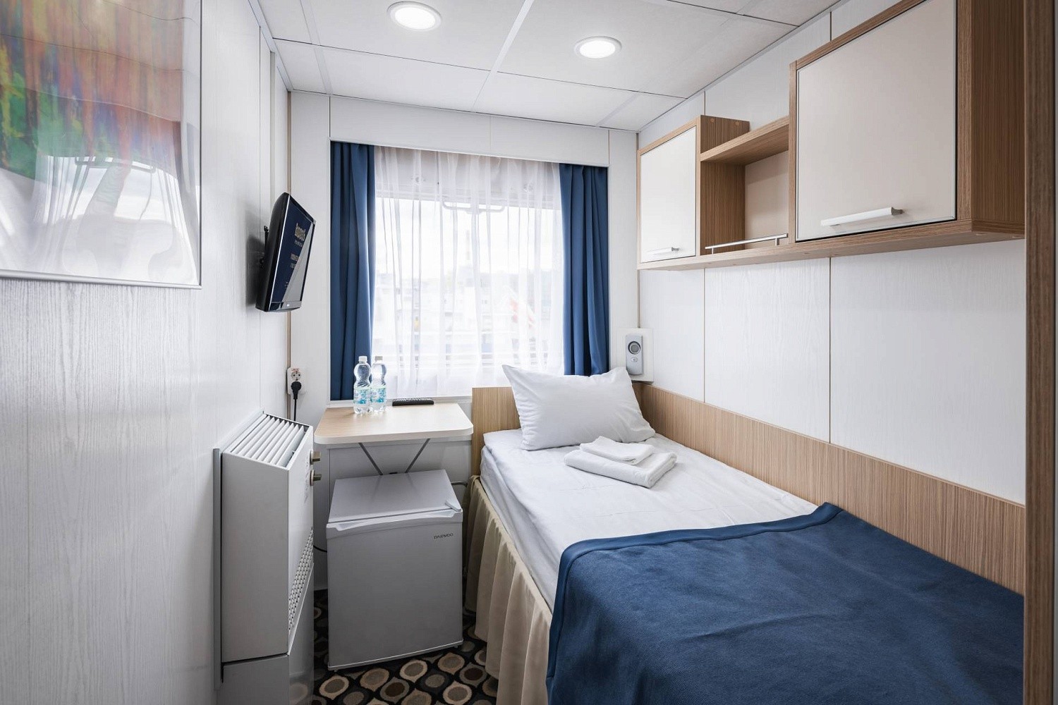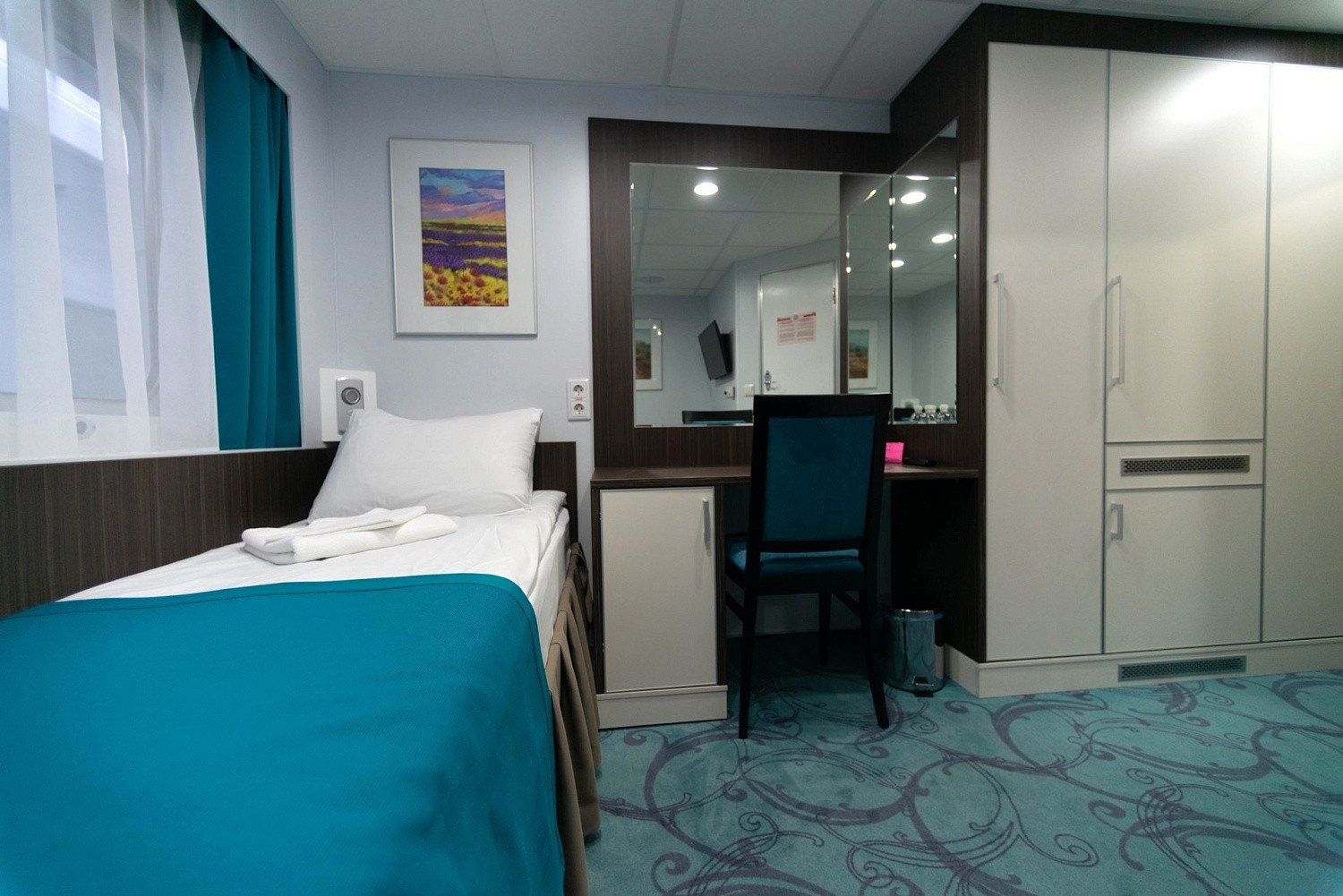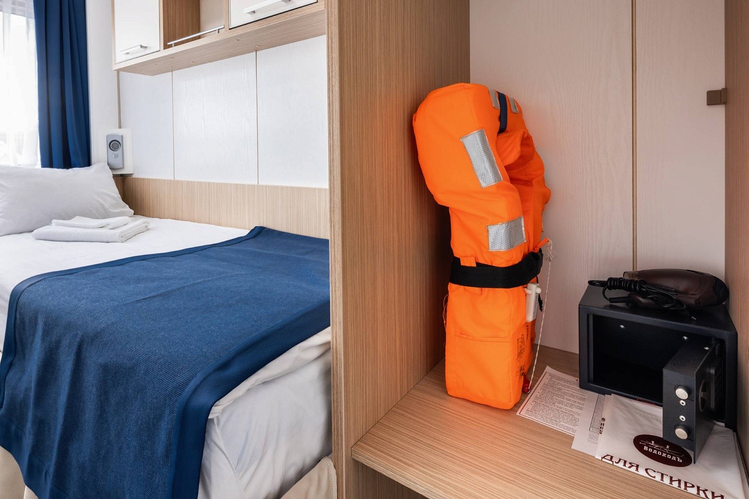 В каюте: одно спальное место, шкаф для одежды, кондиционер, радио, телевизор, холодильник, фен, сейф, обзорное окно, электророзетка на 220V, душ, санузел.
