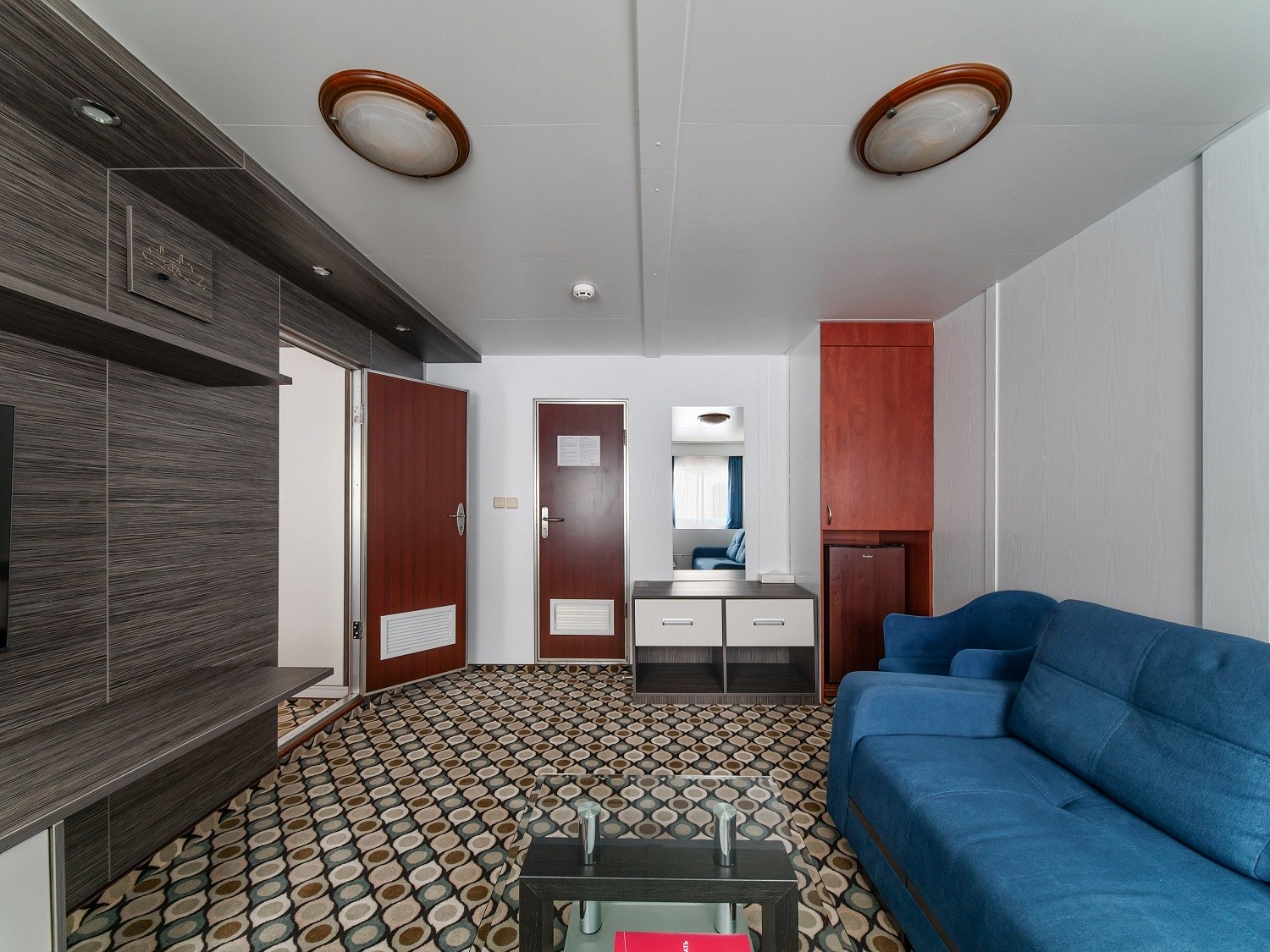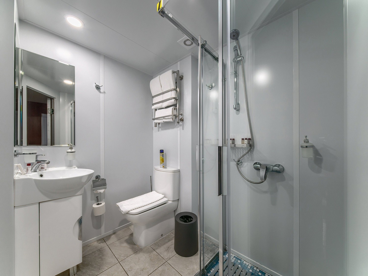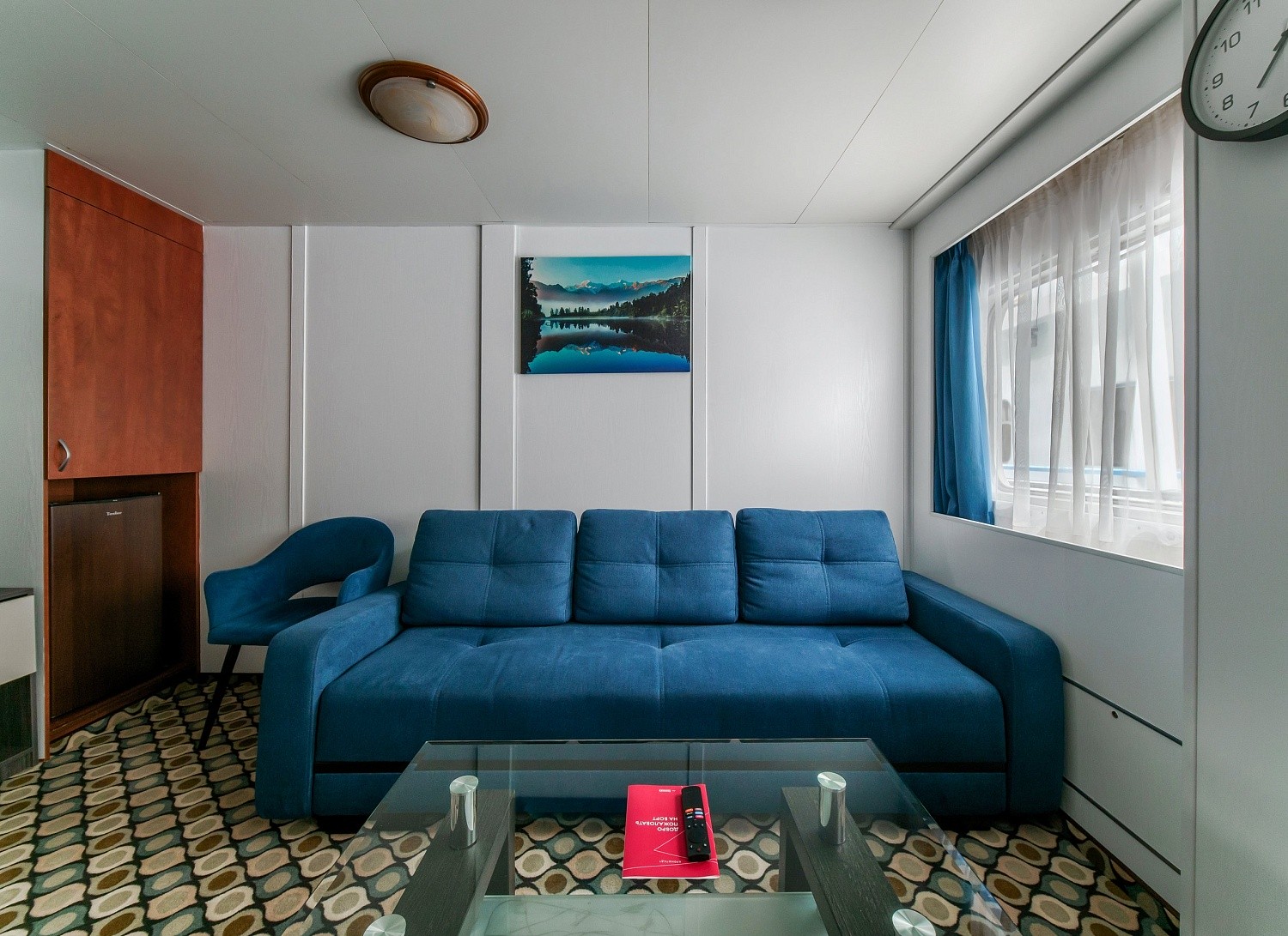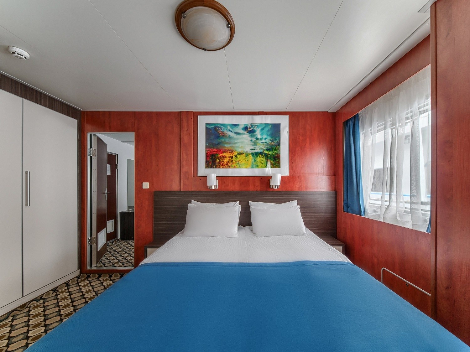 В каюте: одно спальное место, шкаф для одежды, кондиционер, радио, телевизор, холодильник, фен, сейф, обзорное окно, электророзетка на 220V, душ, санузел.