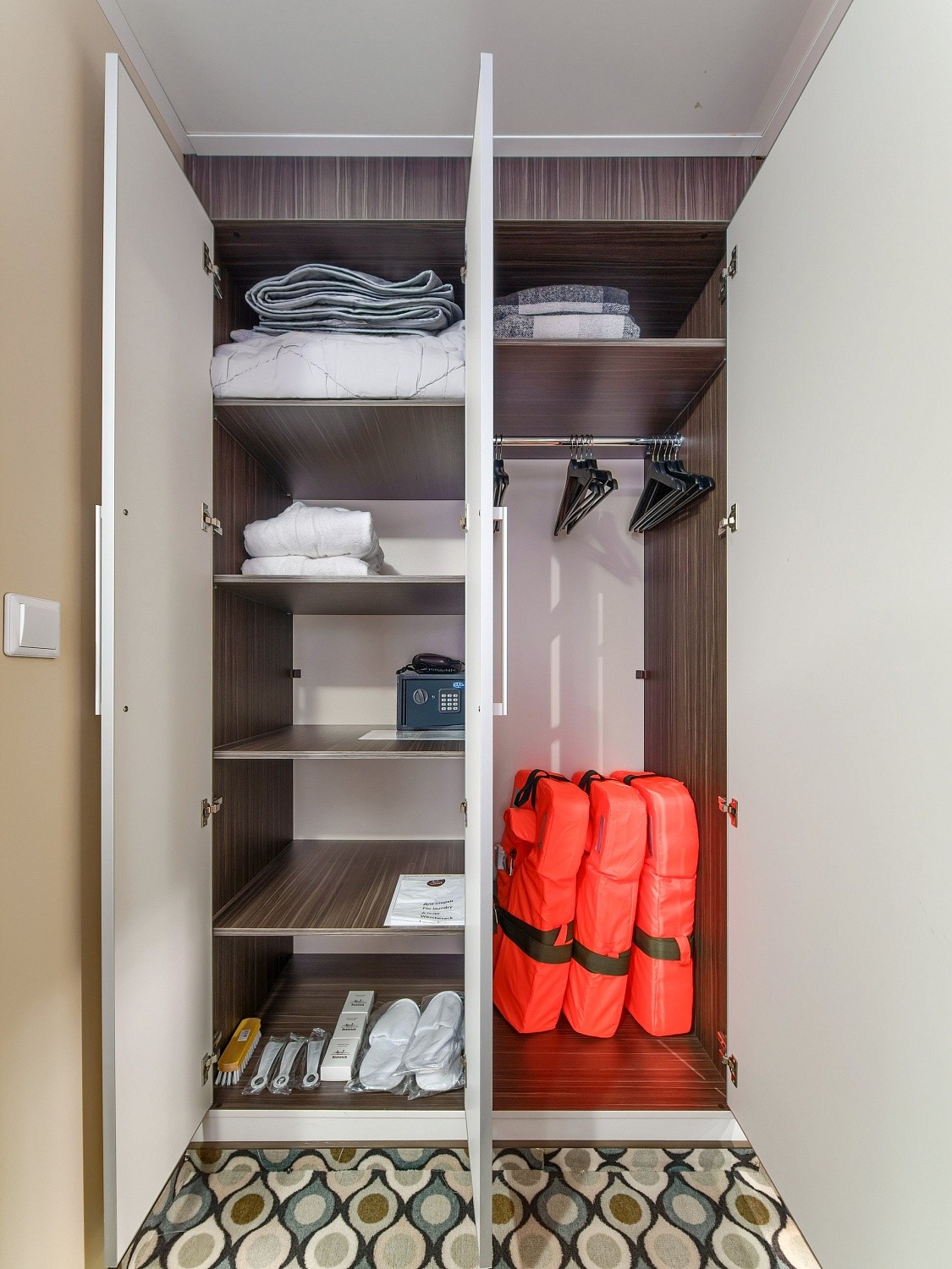 В каюте: два спальных места, шкаф для одежды, трюмо, кондиционер, радио, телевизор, холодильник, фен, сейф, обзорное окно, электророзетка на 220V.