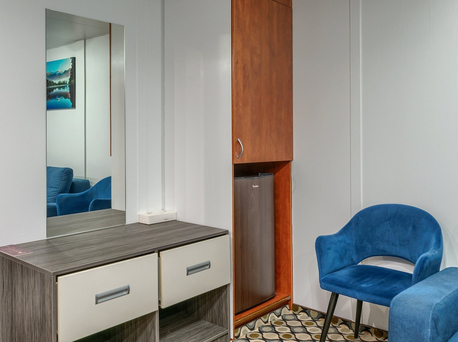 В каюте: два спальных места, шкаф для одежды, трюмо, кондиционер, радио, телевизор, холодильник, фен, сейф, одно обзорное окно, электророзетка на 220V.