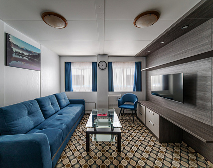 В каюте: три спальных места (два внизу, одно — вторым ярусом), шкаф для одежды, трюмо, кондиционер, радио, телевизор, холодильник, фен, сейф, обзорное окно, электророзетка на 220V.