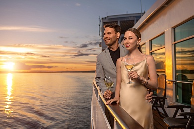 - Полупансион (завтрак + ужин): завтрак — шведский стол или заказная система с элементами шведского стола, фиксированная рассадка. Включённые напитки (без ограничения): вода*, сок, чай, кофе; ужин — заказная система питания (выбор блюд со 2-го дня круиза), фиксированная рассадка. Включённые напитки (без ограничения): вода*, чай, кофе, кисломолочный продукт (1 стакан, 200 мл); порционно на выбор - вино красное / белое / игристое (1 бокал, 125 мл) / водка (1 рюмка, 50 мл) / пиво (1 бокал, 300 мл) / домашний морс (1 бокал, 200 мл).
