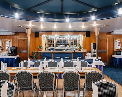 - Ужин — заказная система питания (выбор блюд со 2-го дня круиза). Включённые напитки (без ограничения): вода, чай, кофе, кисломолочный напиток (1 стакан 200 мл на ужин по запросу гостя). На выбор: вино красное / белое / игристое (1 бокал, 125 мл) / водка (1 рюмка, 50 мл) / пиво (1 бокал, 300 мл), домашний морс (1 бокал, 200 мл);