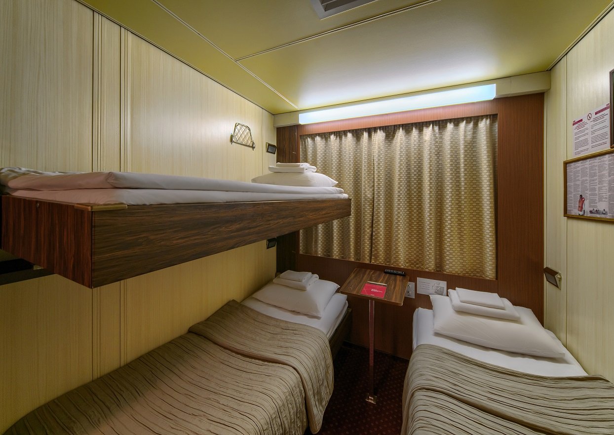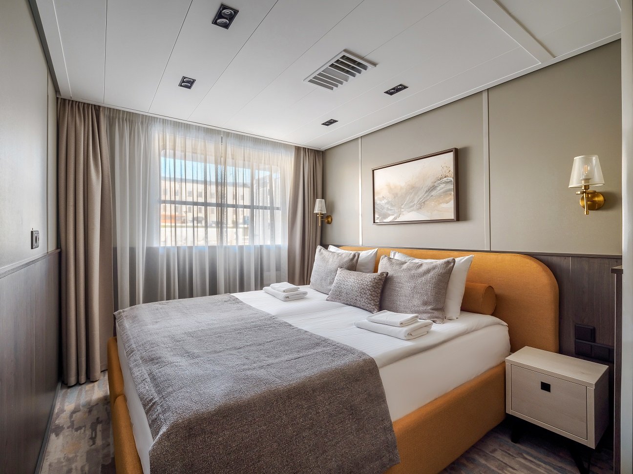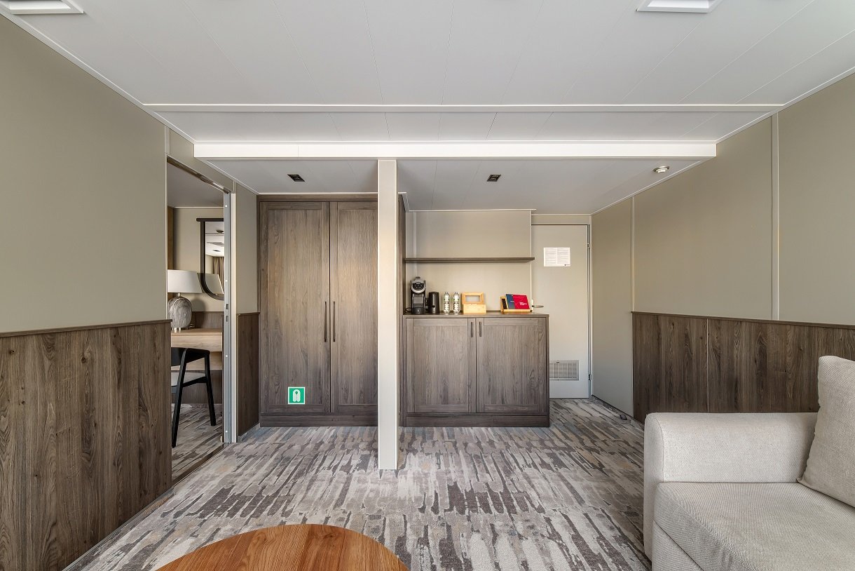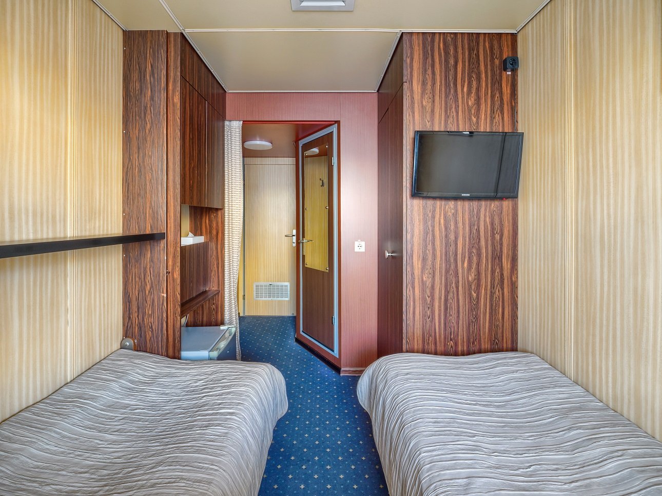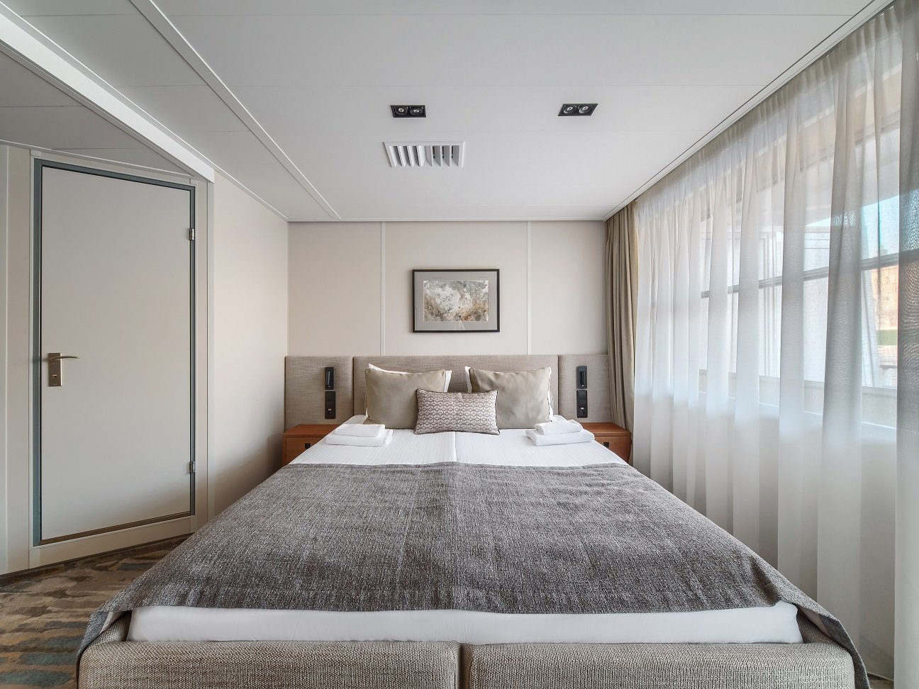 Комфортабельная комната с современным интерьером. Удобства: диван (раскладывается), телевизор, двуспальная кровать (кровати раздвигаются), прикроватные тумбы, письменный стол, холодильник, книжный стеллаж, журнальный столик, пуф, шкаф для одежды, мини-бар, 4 розетки на 220V, две розетки USB, фен. Размер кровати — 175х210 см. В каюте возможно 3-местное размещение.