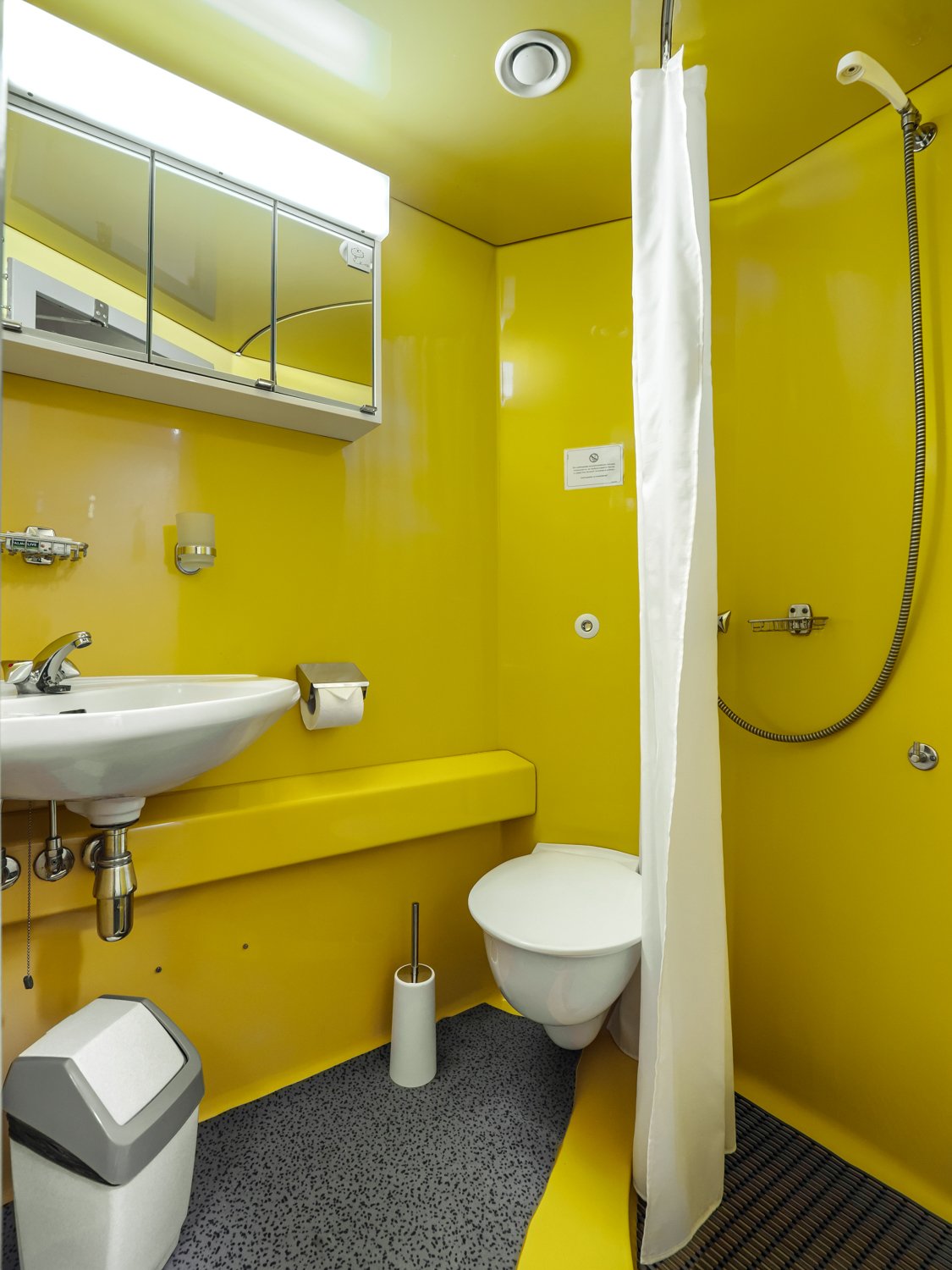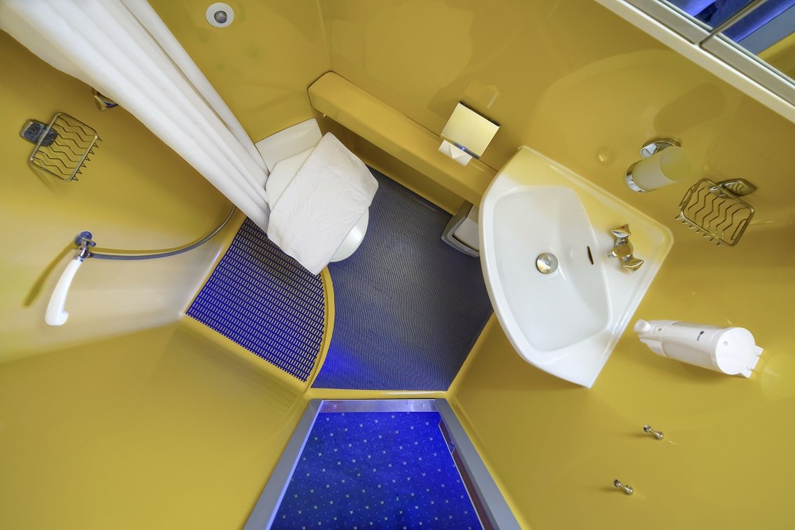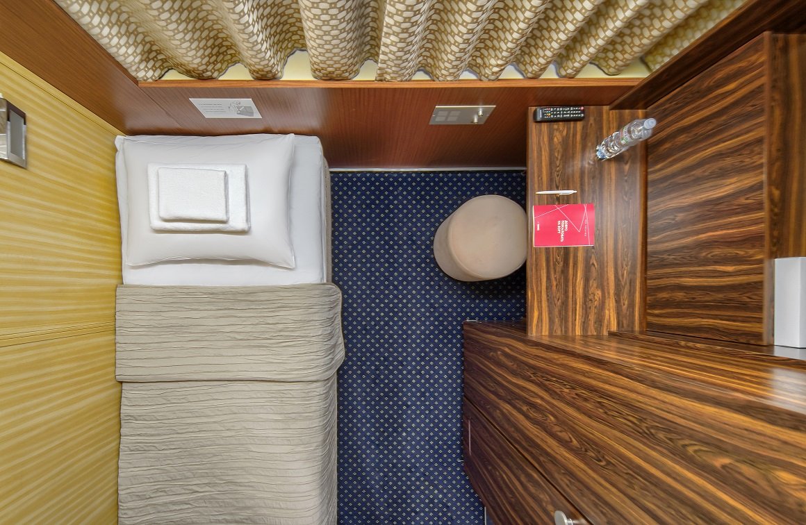 В каюте: одно спальное место, шкаф для одежды, радио, кондиционер, телевизор, холодильник, фен, сейф, душ, санузел, обзорное окно, электророзетка на 220V.